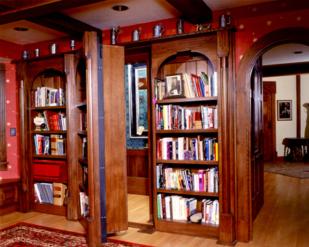 The latch is hidden in the adjoining bookcase. To avoid pinched fingers, the pillars are designed to cover any gap at the hinges as the door is opened and closed.